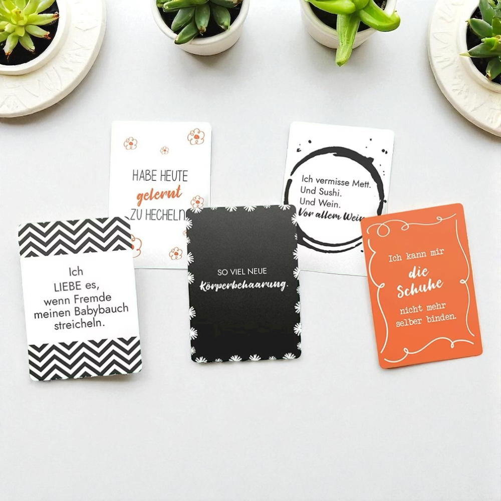 Die ehrlichen Meilensteine für die Schwangerschaft feiern die Realität zwischen Übelkeit, Nestbau und Gänsehautmomenten. Die tolle Box enthält 30 Karten mit sympathisch-direkten Statements für Erinnerungsfotos und kleine Rituale: Karte dazulegen, Foto machen, auf der Rückseite Datum & Notizen festhalten. Hochwertige Premium-Karten, CO₂-neutral gedruckt. Ideal als Mitbringsel zur Babyparty oder fürs Care-Paket.