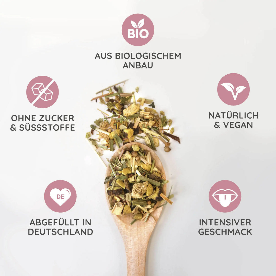 Süßholzwurzel*, Ingwer (20%)*, Schafgarbenkraut (11%)*, Zimt (14%)*, Zitronengras*, Koriander*, Orangenöl*, Brombeerblätter*, Orangenschalen*, Kardamom*, Pfeffer schwarz*