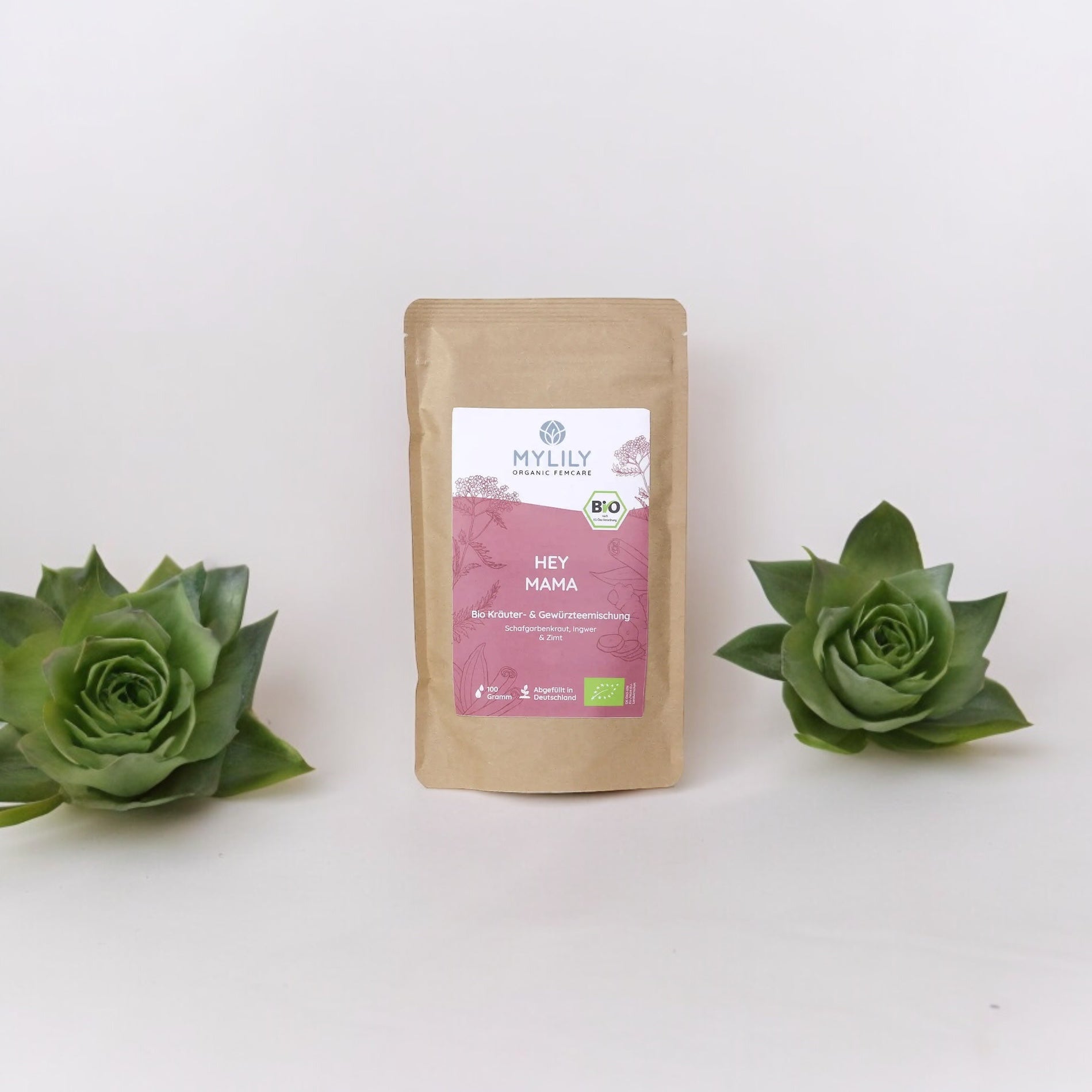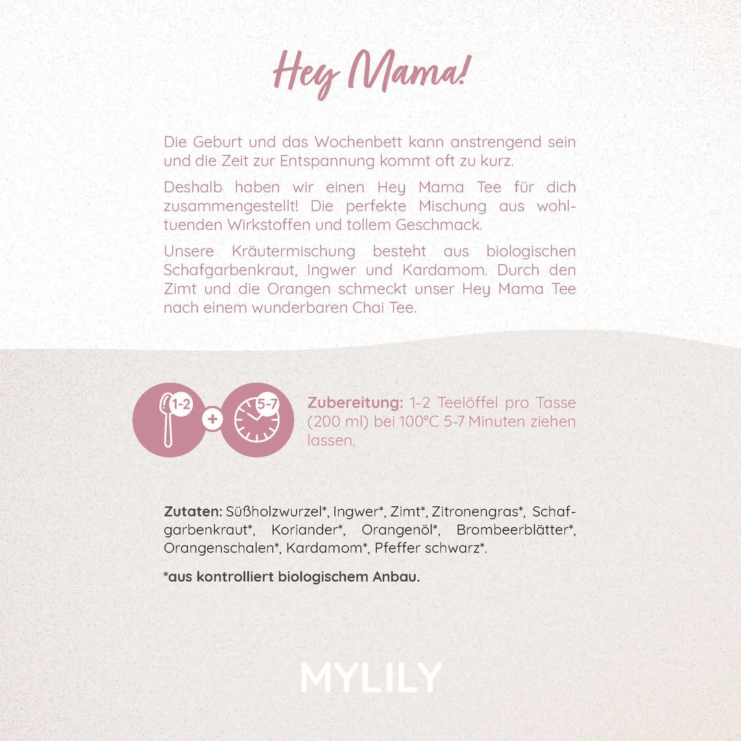 Die Kräutermischung besteht aus biologischen Zutaten wie Schafgarbenkraut, Ingwer und Kardamom für entspannte Momente im Wochenbett. Zusammen mit Zimt und Organen schmeckt der Hey Mama Tee nach einem wunderbaren Chai Tee.