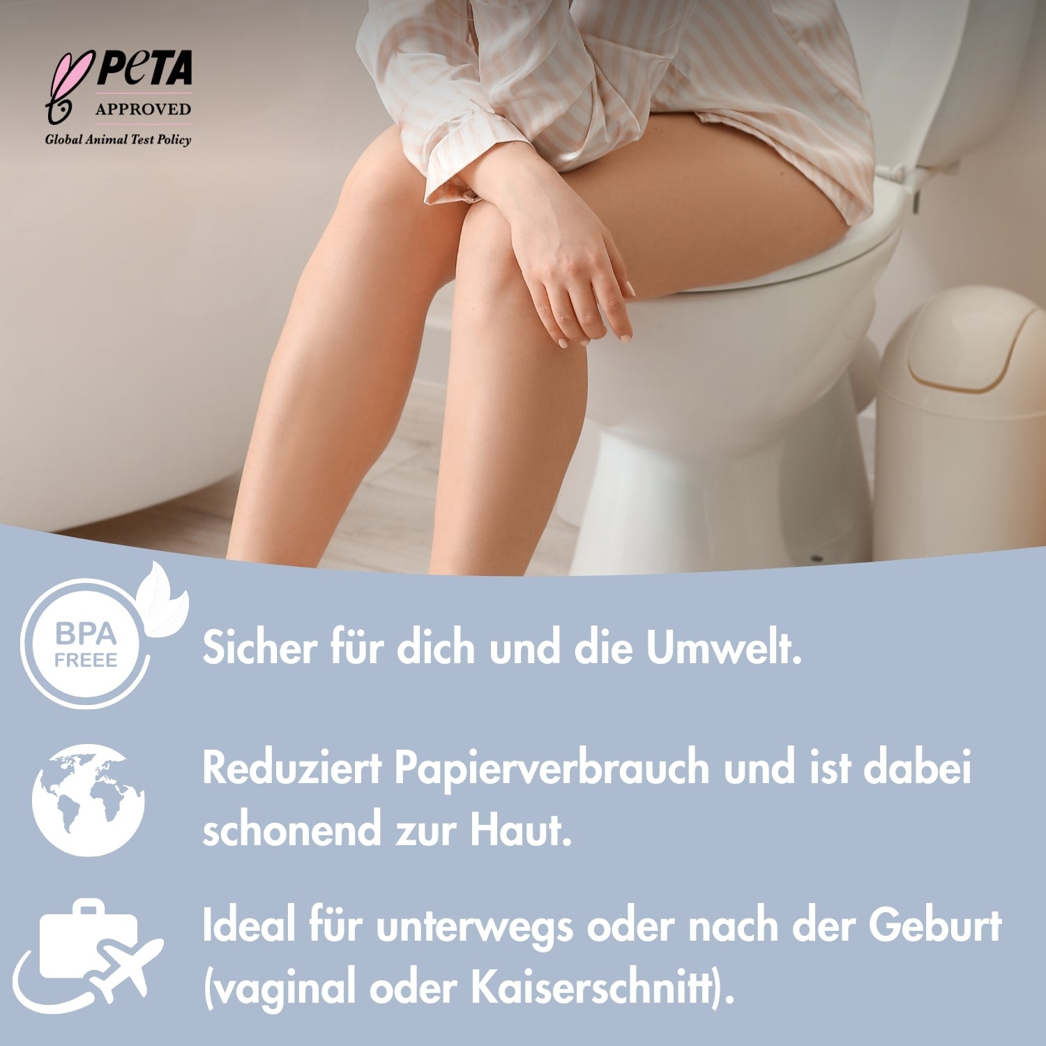 Nach einer vaginalen Geburt solltest du zunächst kein Toilettenpapier verwenden, nicht Wischen, sondern Spülen. Als Alternative gibt es bisher Plastikbecher oder Pospülungen. Hierbei geht gerne mal etwas daneben oder du kommst nicht an die entsprechenden Stellen. Auch nach einem Kaiserschnitt kann das Beugen und Sitzen beim Toilettengang als sehr unangenehm empfunden werden.